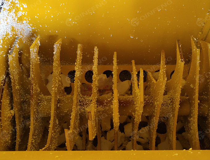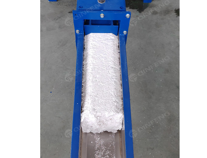 傾斜投料斗一便于投 EPS 物料,二物料不會(huì)在破碎過程中將物料推出料斗。發(fā)泡聚苯乙烯的熱熔回收 機(jī)用破碎刀,平行放置的刀軸,刀軸上對稱地固定有刀片,刀軸上的刀片相互錯(cuò)位排列,并且每根 刀軸上的相鄰刀片以相同方向錯(cuò)開一定角度排列于刀軸上。物料破碎后用電機(jī)帶螺桿壓出成塊。